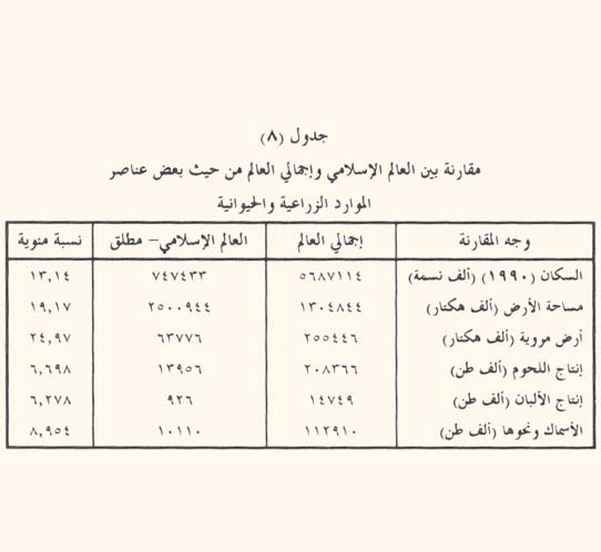 ب- الجدول (8) يعرض بيانات إحصائية عن بعض عناصر الموارد الزراعية وما يرتبط بها من إنتاج حيواني وكذلك إنتاج أسماك، وهي عن العالم الإسلامي وعن إجمالي العالم. [ ص: 137 ]